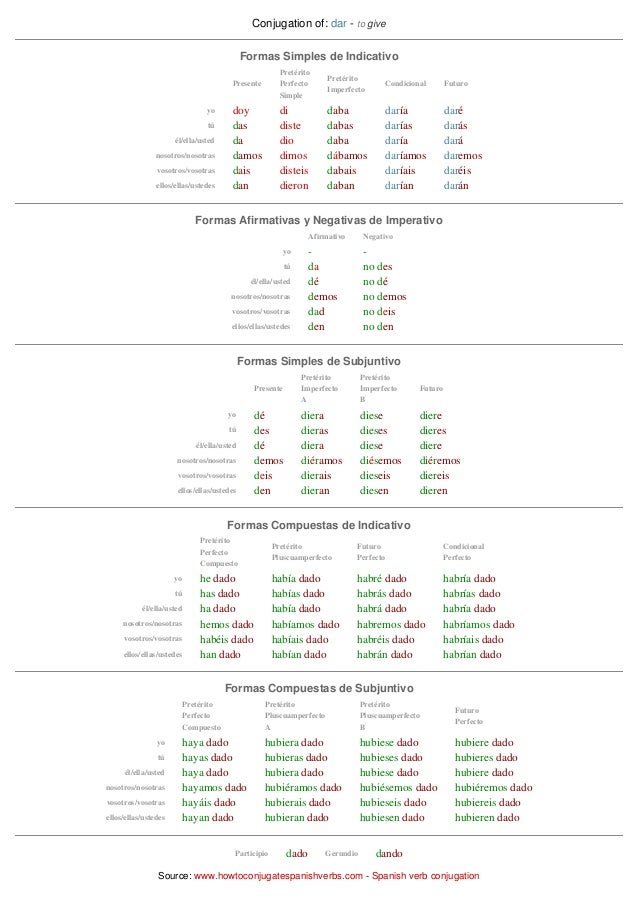 You used to give / you were giving. See the definition, pronunciation, examples and practice exercises for each form of dar. Web learn how to conjugate the verb dar (to give) in spanish in different tenses and modes. Over 1000 spanish verbs conjugated. Web this post is all about dar and its conjugations, from the meaning of this irregular verb and its verbals to the indicative, subjunctive, and imperative conjugations.